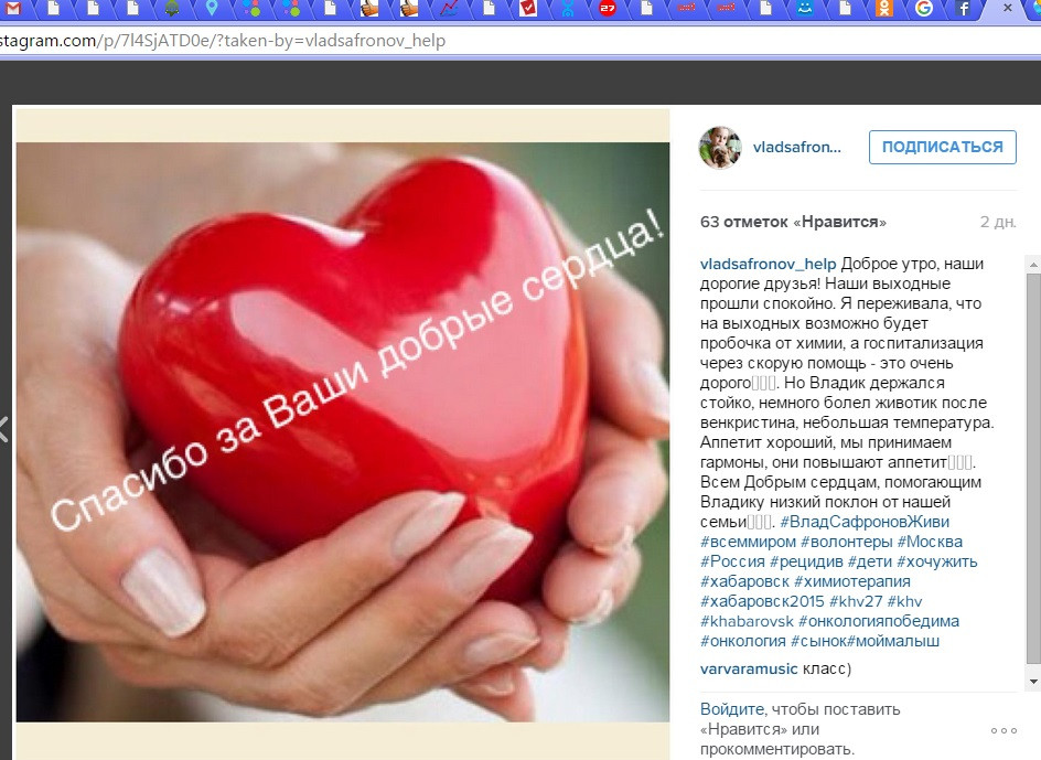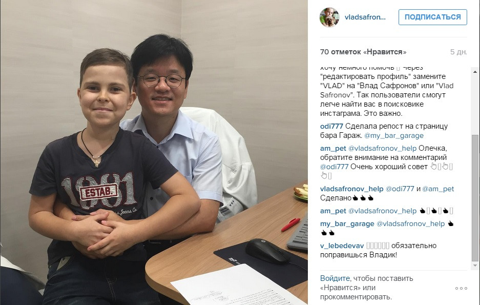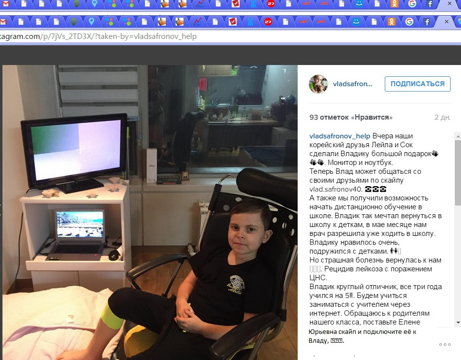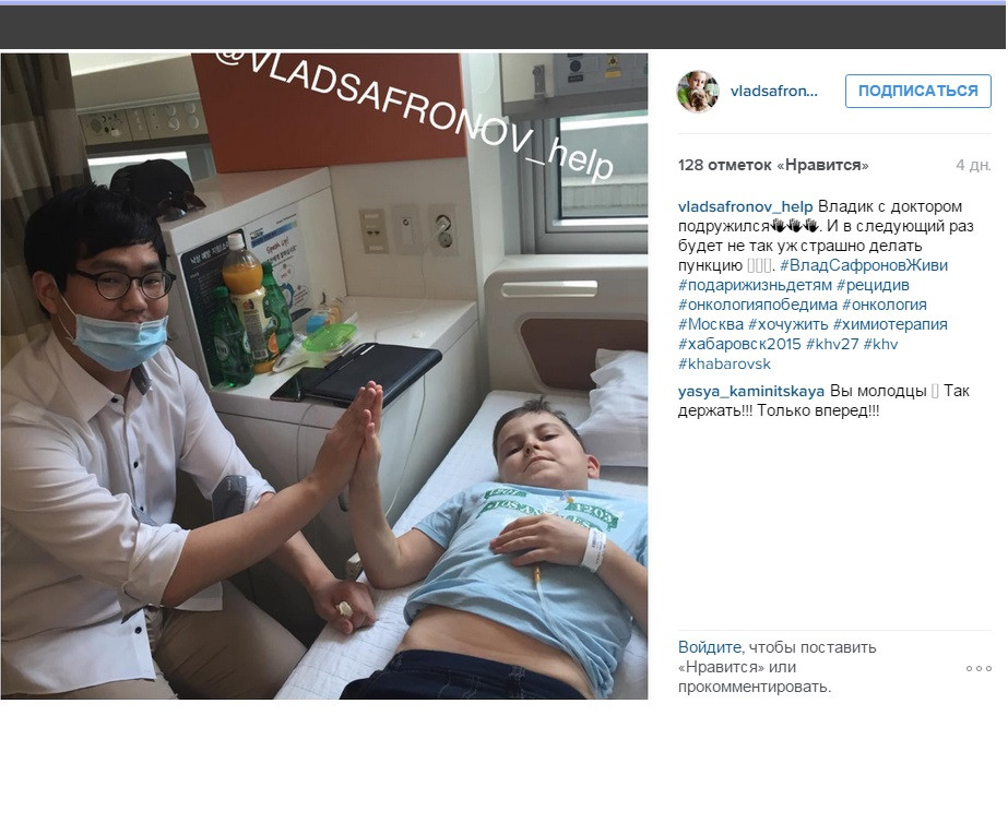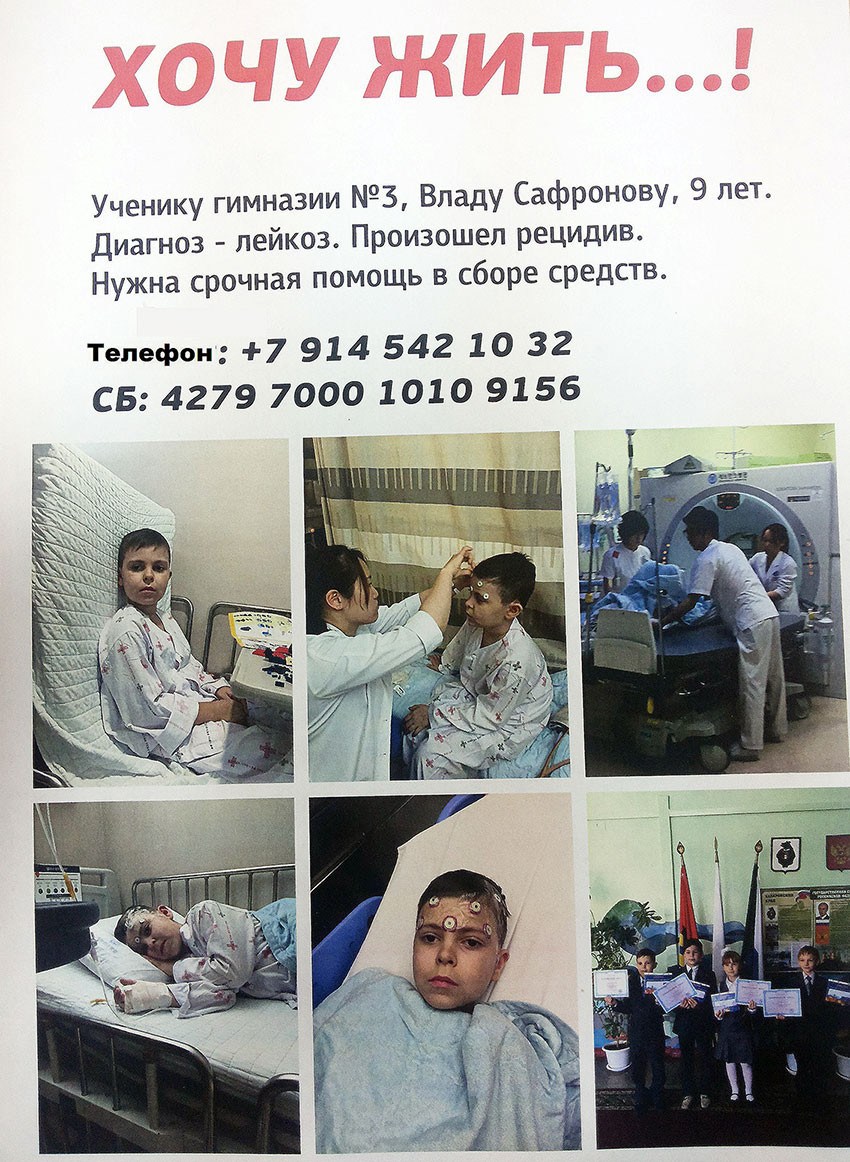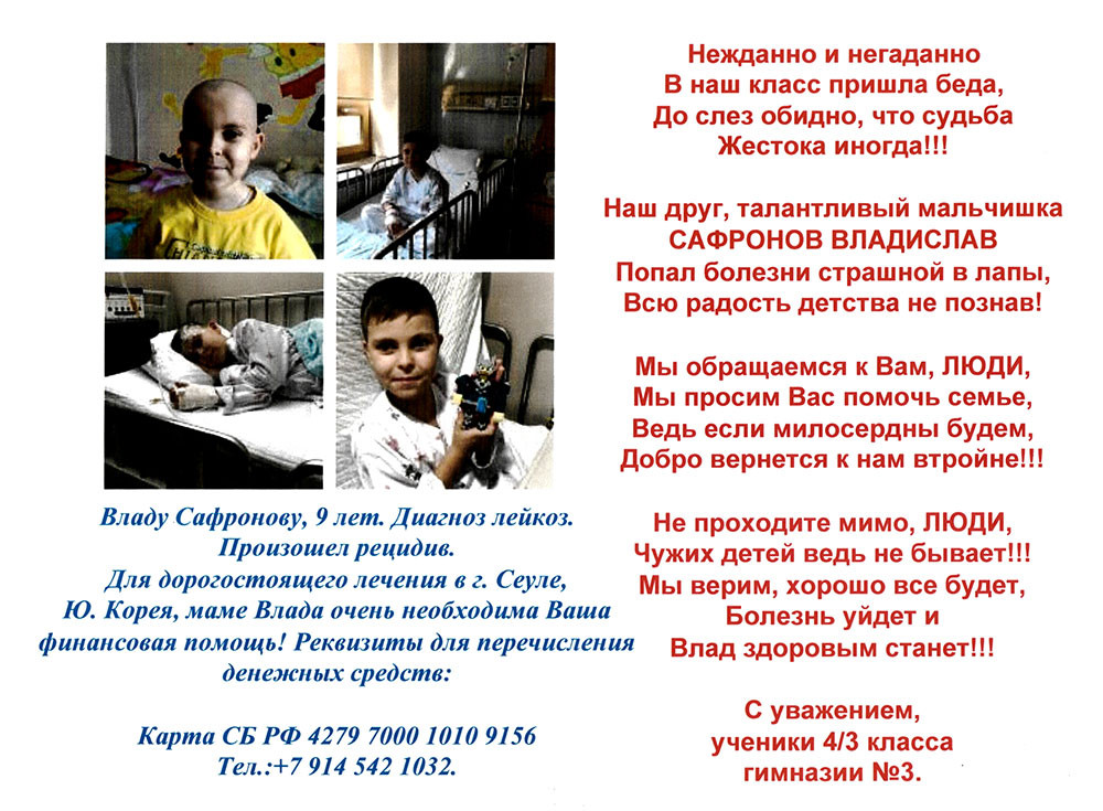 Моя дочь Снежана учится в 4м классе в гимназии имени М.Ф. Панькова. С первого класса с ними учился Влад Сафронов. Но он учился на дому в связи с онкологическим заболеванием. И учился на «отлично». Этой весной он пришел в школу. Все были рады его выздоровлению, а в сентябре мы все были расстроены тем, что у него произошел рецидив. Диагноз - лейкоз.