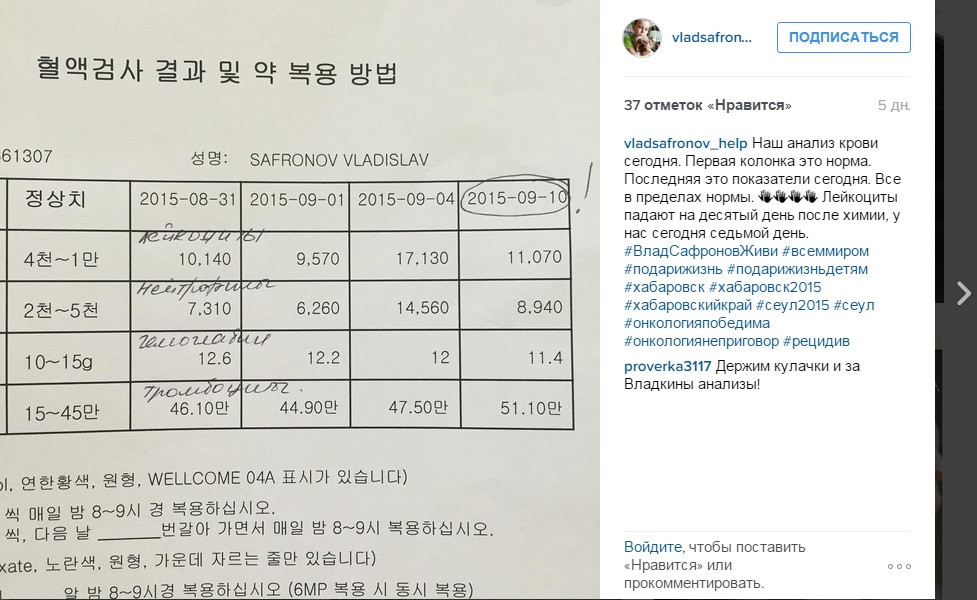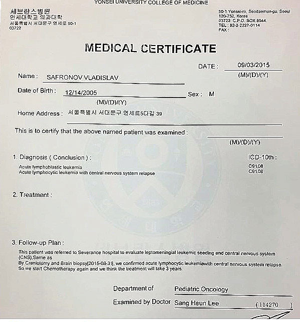 В июле 2015г. Владику стало очень плохо. У него сильно заболела голова, он потерял память, забыл буквы и цифры. Ужас!!! В Хабаровске не смогли поставить Владику диагноз. И мама срочно увезла Владика в Сеул (Корея). Врачи в Сеуле за 4 дня поставили диагноз, опять страшный диагноз! Болезнь вернулась к Владику. Нейролейкоз с поражением ЦНС. Раковые клетки были обнаружены в голове.
