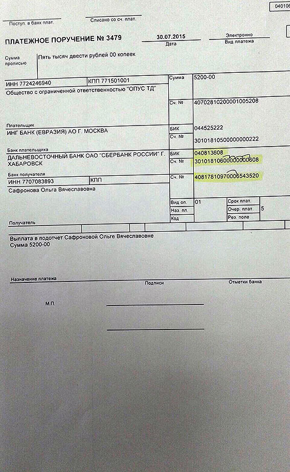 ФИО получателя: Сафронова Ольга Вячеславовна